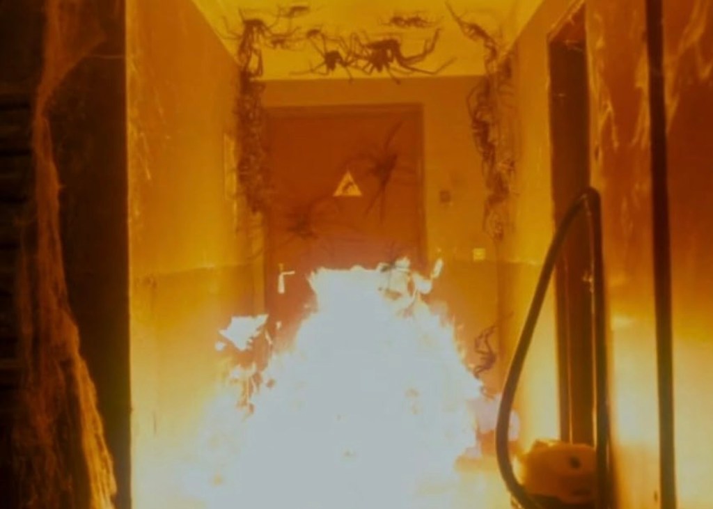 The film features several impressively designed and executed death sequences. In one scene, a man working out in his bedroom observes a large spider in the mirror. When he attempts to eliminate it, he inadvertently uncovers a vast web of spider nests beyond the walls. In another scene, a cleaning lady discovers an overwhelming number of spiders in the apartment’s attic and is attacked when she tries to eliminate them with a spray.