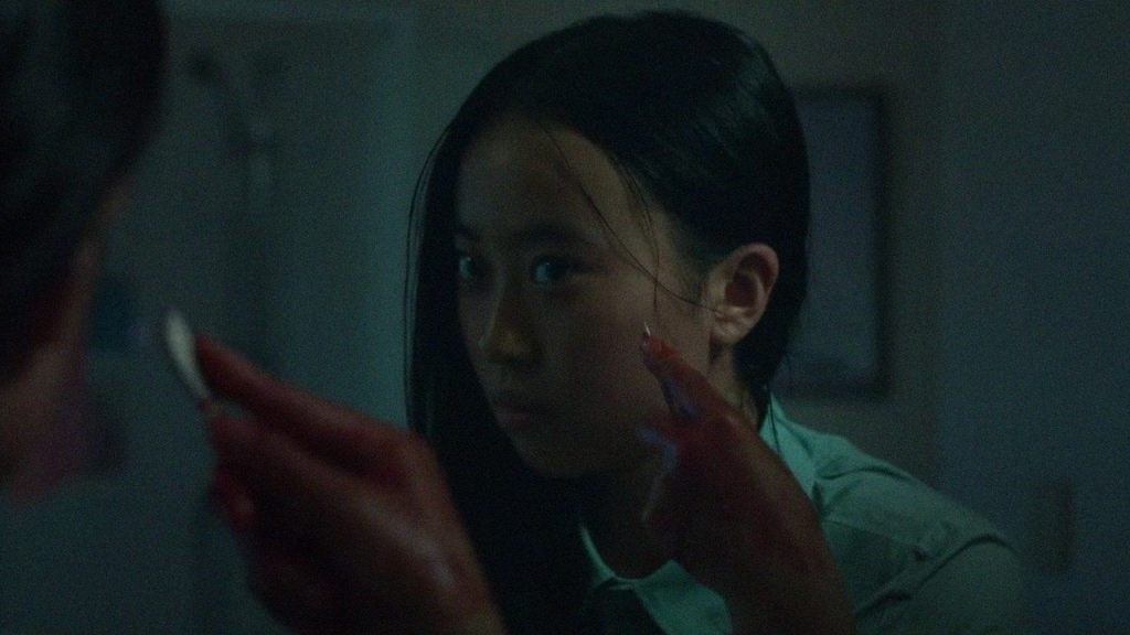 The opening demise of Wei’s father was freaky and hooks you right away. First the skin graft formula grows over his mouth and nose. If that’s not creepy enough, he repeatedly attempts to cut open his mouth with it re-healing rapidly. Not creepy enough? Then little Wei starts frantically stabbing her father’s mouth to keep it open. What a scene!