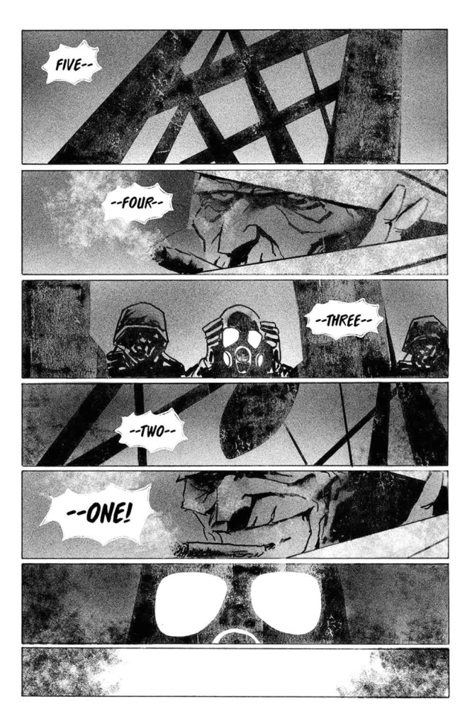 It ramps in clean, mean steps, and it uses the form to do it. First, you get the vibe of procedure and obedience, all hard angles and cramped interiors. Then the siren begins to dominate the page, that “AWOO” smeared across the horizon like a curse you can hear through your teeth. A couple of pages later, it gets even simpler: a countdown broken into thin horizontal strips, five-four-three-two-one, each strip a breath you do not want to take. That’s the book telling you, politely, you are about to watch control fail.