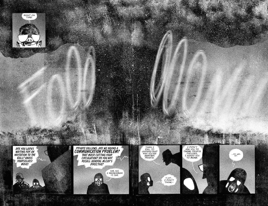 Jeffrey Alan Love’s art is basically an argument for silhouettes as terror. Faces are often reduced to slabs of shadow with bright, blank eye shapes. Gas masks become cartoonish and holy at the same time, those round filters like they could be mouths, or eyes, or neither. The ink and texture choices matter here because the page is never clean. Everything looks dusted with grit, like the comic itself is contaminated. Even when a panel is mostly empty sky, it’s a sky full of noise. That grain becomes dread. You cannot rest your eyes.